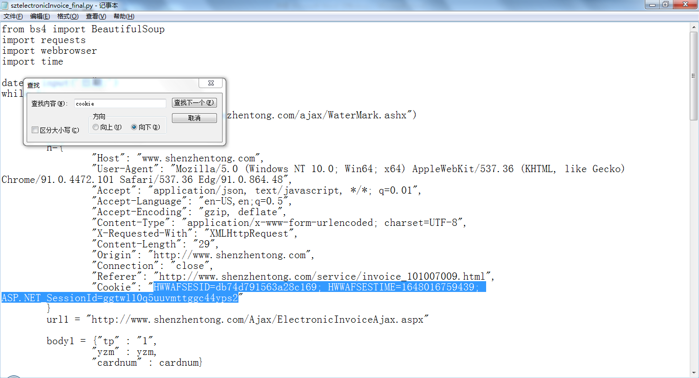 返回桌面后,双击sztelectronicInvoice_final.py,按住Ctrl + F输入Cookie替换掉原来的Cookie,如图所示