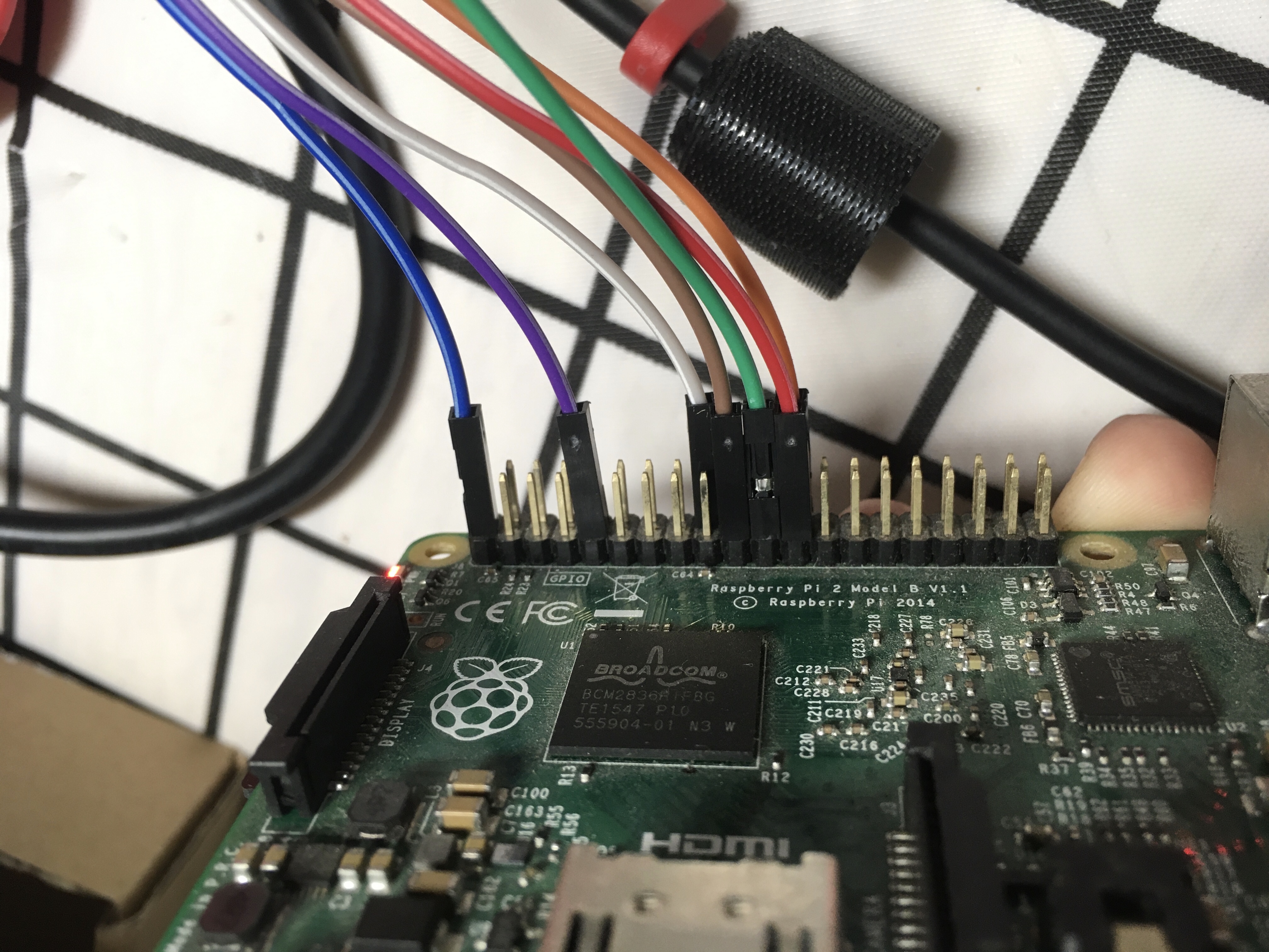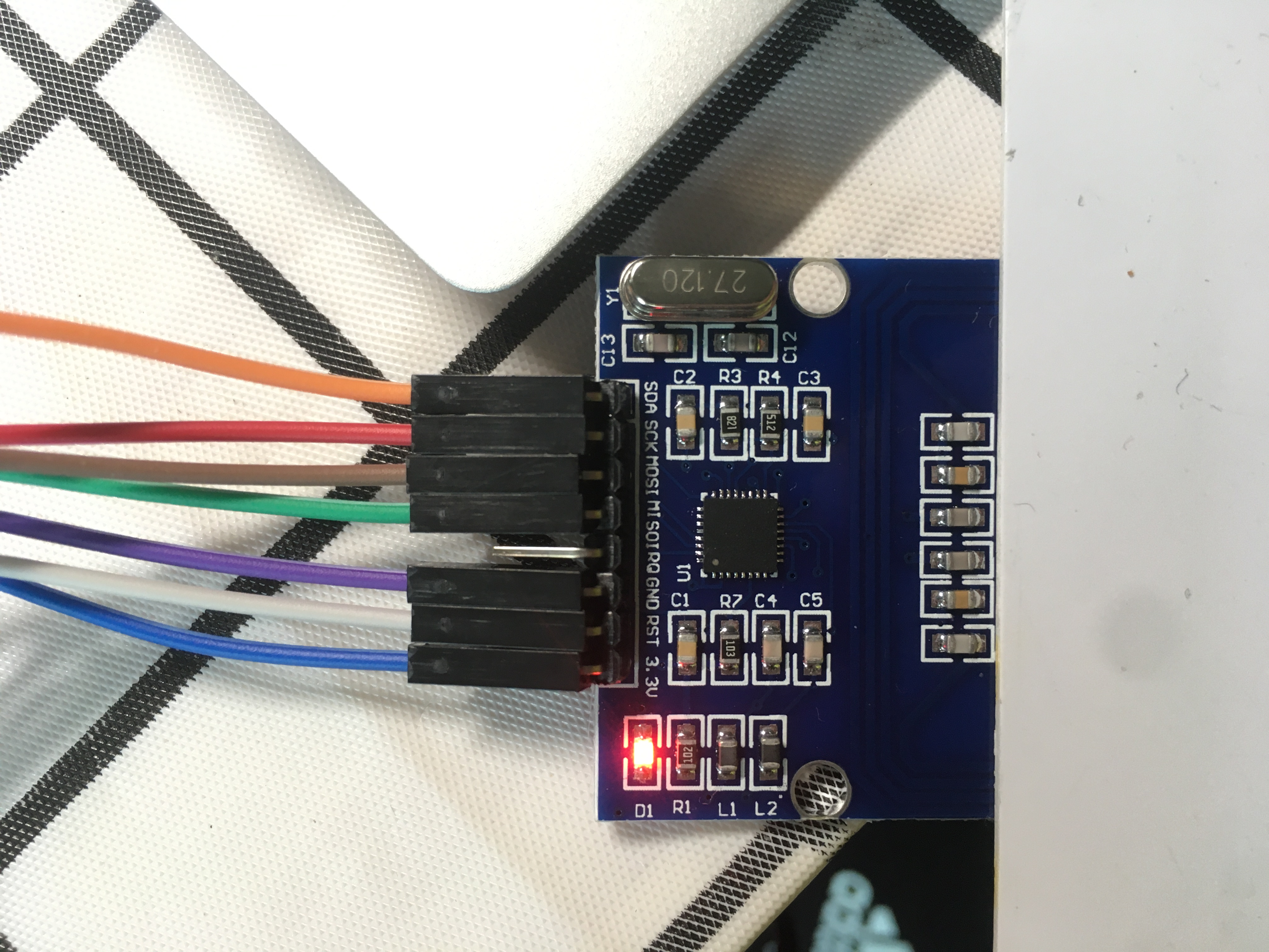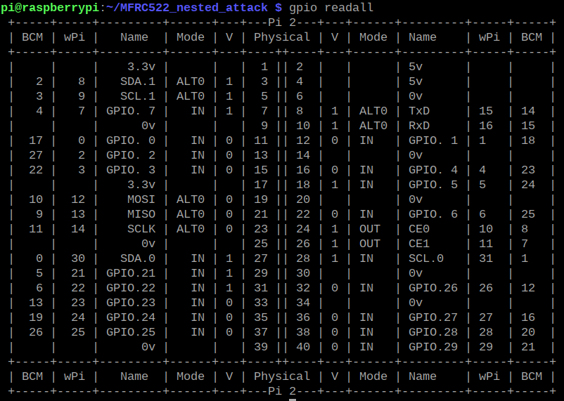 | raspberry | (wirepi) pin | MFRC522 | | :—-: | :—-: | :—-: | |Reset | 5 | RST | |SPI CE0 |10 |SSN(slave select)| |SPI MOSI| 12| MOSI| |SPI MISO |13| MISO| |SPI SCK| 14| SCK| |3.3V| |Vcc| |GND| |GND| 将步骤1和上表pin脚一一对应连接